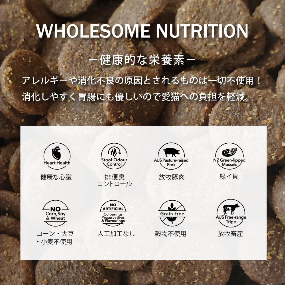 オーストラリア産サーモン、ホルモン不使用チキン、グリーントライプ、サツマイモ、鶏脂、エンドウ豆、ナチュラルフレーバー、カボチャ、ホウレンソウ、ブロッコリー、リンゴ、クランベリー、ウコン、緑イ貝、塩化アンモニウム、塩化カリウム、ビタミン・ミネラル類(ビタミン A、D、E、K、B1、B2、B3、B5、B6、B12、葉酸、ビオチン、塩化コリン、クエン酸、タウリン、硫酸亜鉛、硫酸鉄、キレート亜鉛、硫酸銅 、酸化マンガン、ヨウ素、セレン)、塩化コリン、プレバイオティクス(フラクトオリゴ糖(FOS)、マンナンオリゴ糖(MOS))、ライトミネラルオイル、ユッカシジゲラエキス、L-リジン、酵素(アミラーゼ、プロテアーゼ)、プロバイオティクス(枯草菌)、DL-メチオニン、ミックストコフェロール、ローズマリーエキス