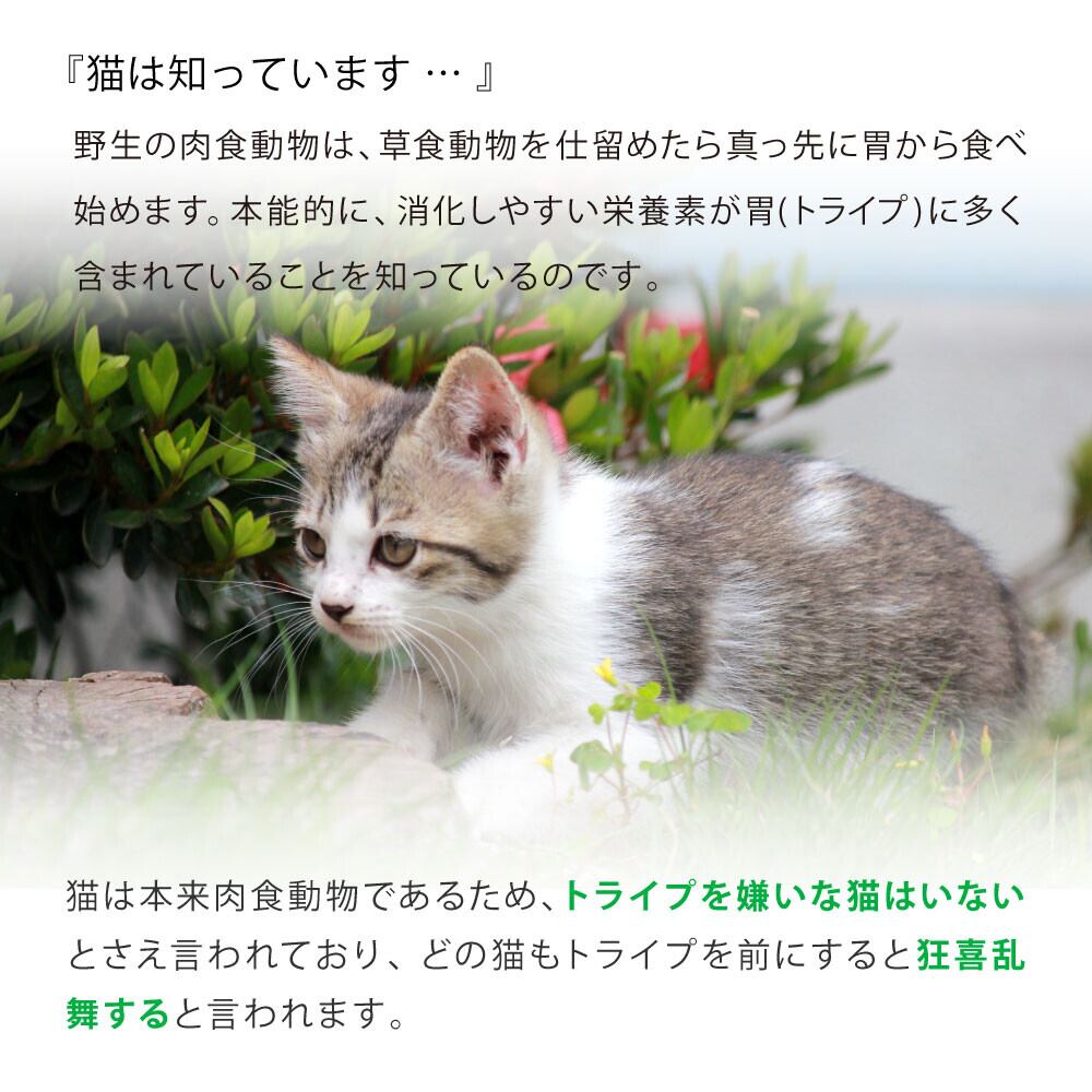 ■肉食性の猫本来の正しい食事「トライプ」とは反すう動物の第4胃のこと。牛、羊、山羊、鹿などの反すう動物は4つの胃を持っています。食べた食物(草、干し草など)は噛まずに飲み込まれ、第1胃と第2胃に送られます。草や干し草などは、胃の中の微生物によって分解され、口に戻ったり胃に戻ったりしながら噛み砕かれ唾液と混ぜ合わせられます。そうして第2胃、第3胃、第4胃を通り、胃液、消化酵素によって消化されます。最後に第4胃から小腸に送られ、十分に消化された栄養を摂取できるのです。 その第4番目の胃を内容物ごと刻んだものがトライプです。まさにこれから小腸で吸収されようとする消化が進み吸収の最も良い状態の栄養素を与えることになります。