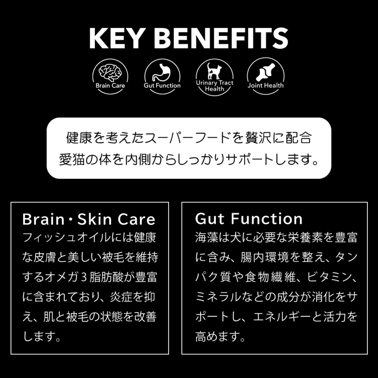 ワイルドカット=ホールプレイ(丸ごと捕食)の食事に着想を得ており、愛猫の自然な食事のニーズに沿った栄養豊富レシピを提供します。