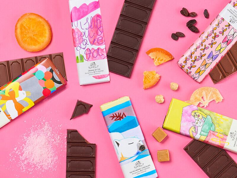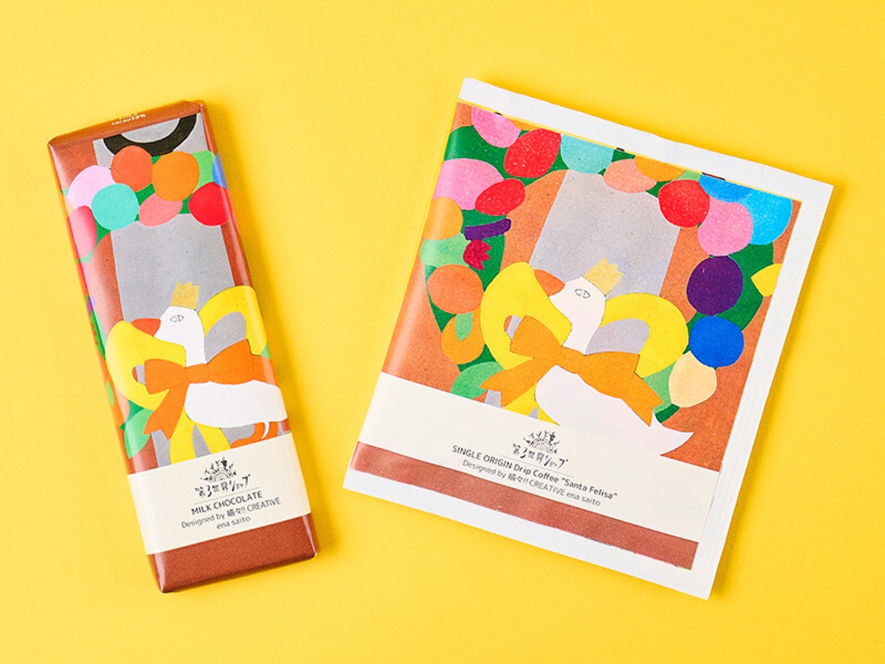 5人のアーティストの作品が、フェアトレードチョコレートとドリップコーヒーのパッケージになりました。