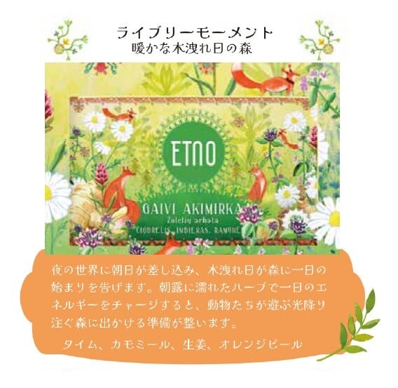【ブランド紹介】ETNO(エトノ)ハーブティーは、バルト三国のひとつ、豊かな自然に恵まれたリトアニアの工場で丁寧に製造されています。老舗ハーブティーメーカーならではのこだわりを大切にしながら、受け継がれてきたハーブの知恵を活かし、現代のライフスタイルにも寄り添う飲みやすい味わいに仕上げました。リトアニアの美しい風景や、オリジナルのおとぎ話を元にデザインされたパッケージは、贈り物としても最適です。