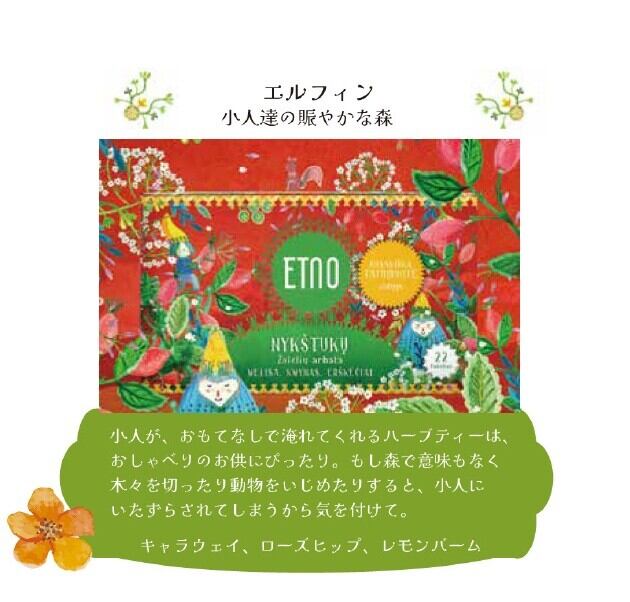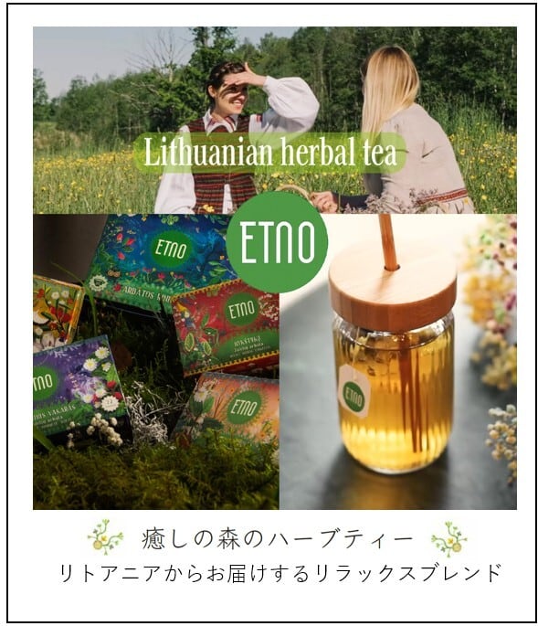 【ブランド紹介】ETNO(エトノ)ハーブティーは、バルト三国のひとつ、豊かな自然に恵まれたリトアニアの工場で丁寧に製造されています。老舗ハーブティーメーカーならではのこだわりを大切にしながら、受け継がれてきたハーブの知恵を活かし、現代のライフスタイルにも寄り添う飲みやすい味わいに仕上げました。リトアニアの美しい風景や、オリジナルのおとぎ話を元にデザインされたパッケージは、贈り物としても最適です。