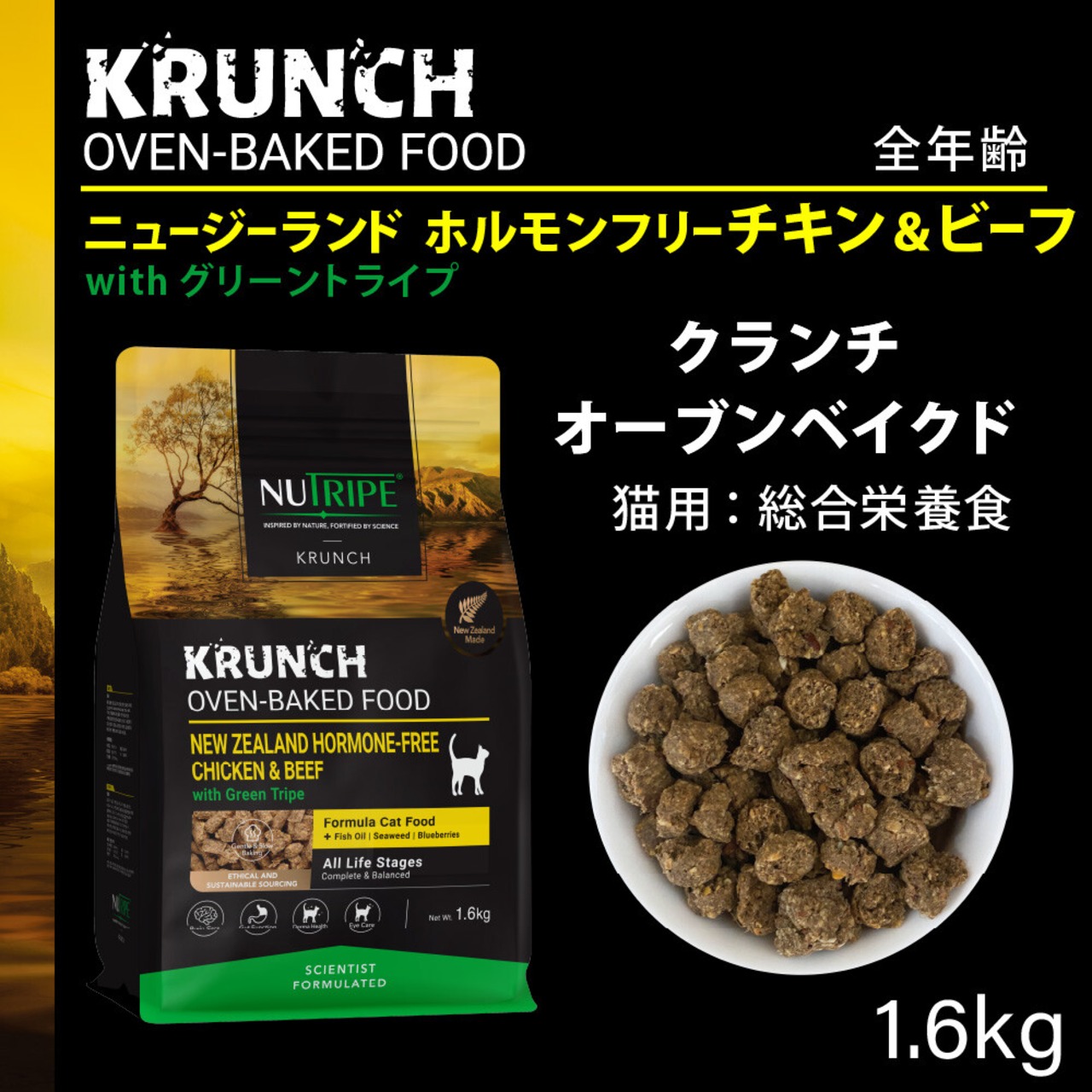 じっくり低温で焼き上げるオーブンベイクド製法により、素材本来の風味と栄養をしっかり保持。動物性のタンパク源とグリーントライプを豊富に配合し、少量ずつ丁寧に製造。さらに、DHAを含む魚油、栄養豊富な海藻、健康をサポートするキウイフルーツなどのスーパーフードをプラスし、猫の健康と活力を育む栄養バランスを実現しました。