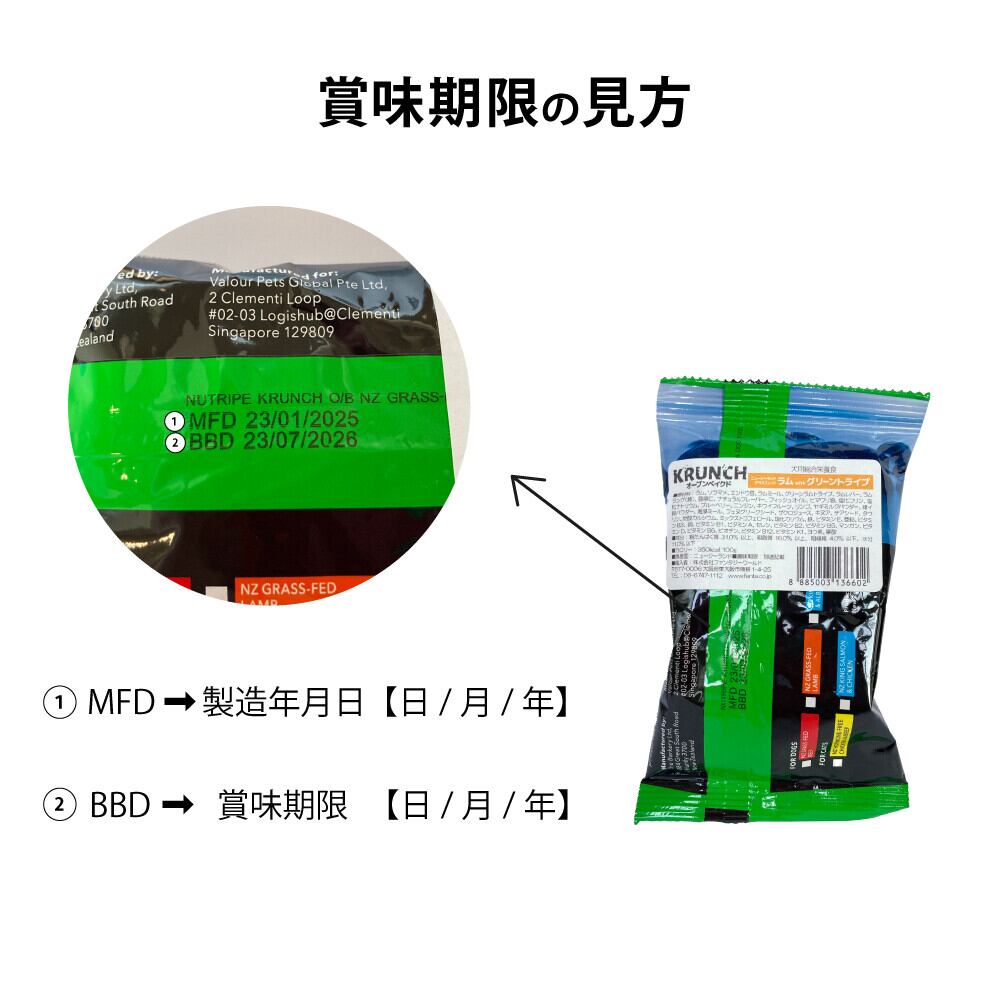 チキン、チキンミール、ソラマメ、エンドウ豆、牛肉、天然香料、グリーンラムトライプ、亜麻仁、ビーフミール、フィッシュオイル、ヒマワリ油、塩化コリン、塩化ナトリウム、ブルーベリー、ニンジン、キウイフルーツ、リンゴ、ヤギミルクパウダー、緑イ貝パウダー、海藻ミール、フェヌグリークシード、ザクロジュース、キノア、チアシード、タウリン、炭酸カルシウム、ミックストコフェロール、塩化カリウム、鉄、ビタミンE、亜鉛、ビタミンB3、銅、 ビタミンB1、ビタミンA、セレン、ビタミンB2、ビタミンB5、マンガン、ビタミンD、ビタミンB6、ビオチン、ビタミンB12、ビタミンk1、ヨウ素、葉酸