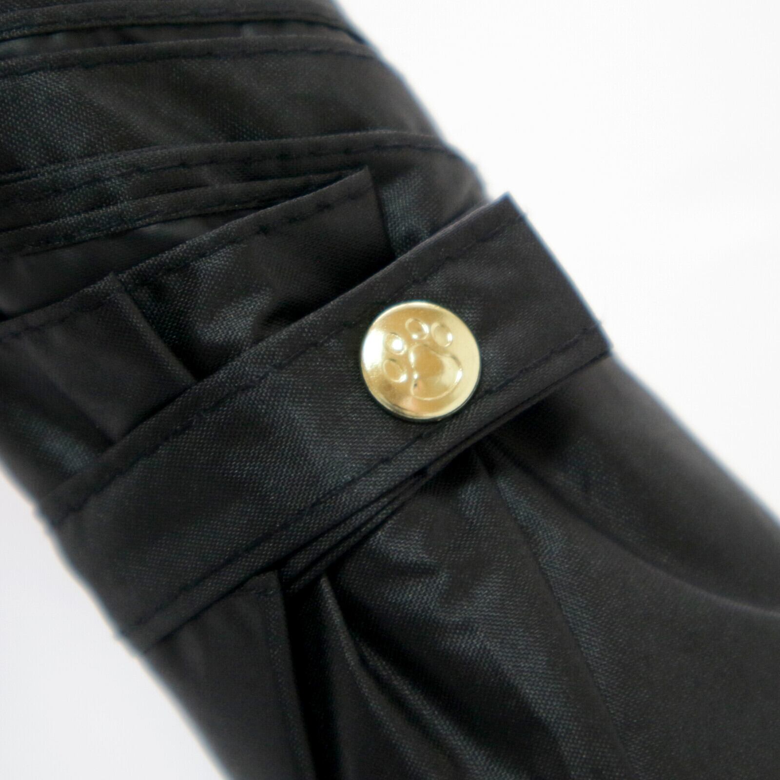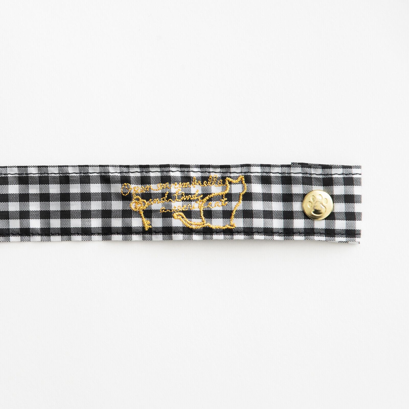 共袋のネームバンドには太幅のギンガムチェック生地に金糸で猫刺繍入り&猫のあしあとホックボタン付きと、色々なところが猫仕様になってます。手元ハンドルは手触りの良いつや消し加工の黒い樹脂製で、手元のボタンで開閉します。