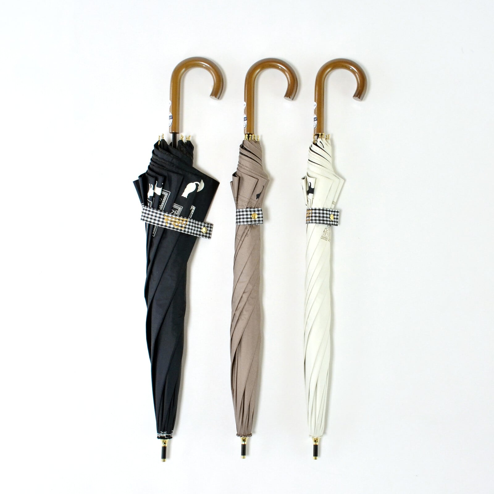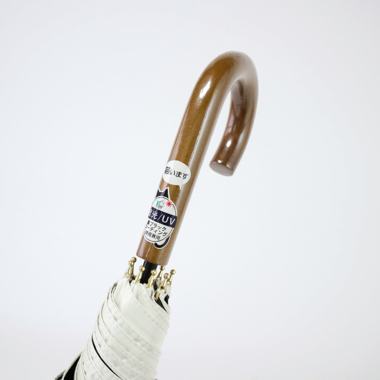 ネームバンドには、ギンガムチェック柄で遊び心をプラス。そしてネームボタンは猫のあしあとモチーフの型押しホックボタン付き。手元は落ち着いたブラウンのハンドルに、猫いますシールも付いてます。細かいディティールまで猫モチーフにこだわったMKN自慢の猫傘です。