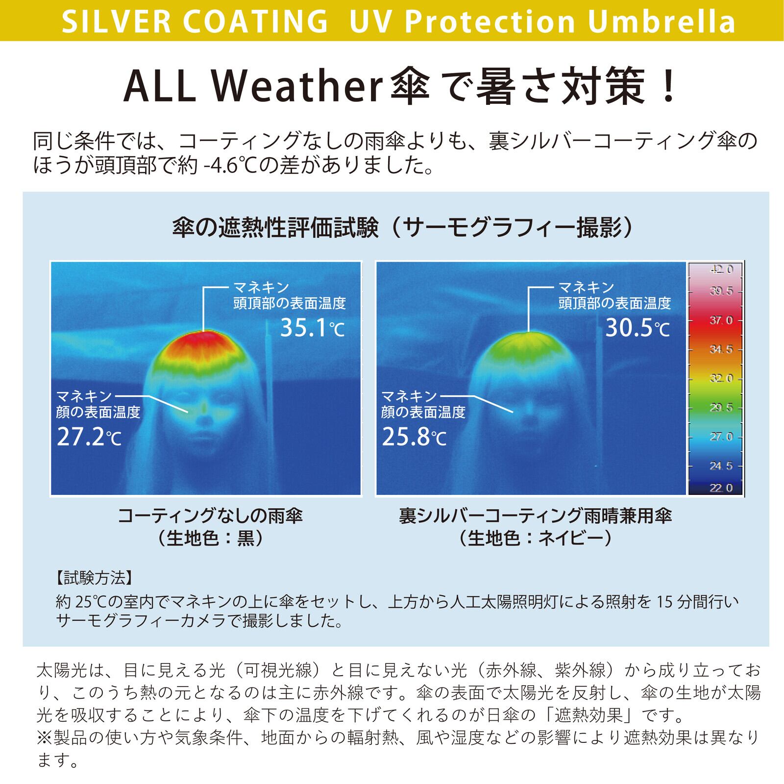 また、コーティング加工なしの通常の雨傘と比較した時に、裏シルバーコーティング傘のほうが約-4℃ほど遮熱効果があると検査結果がでています。夏の暑さ対策としてもご使用いただけます。