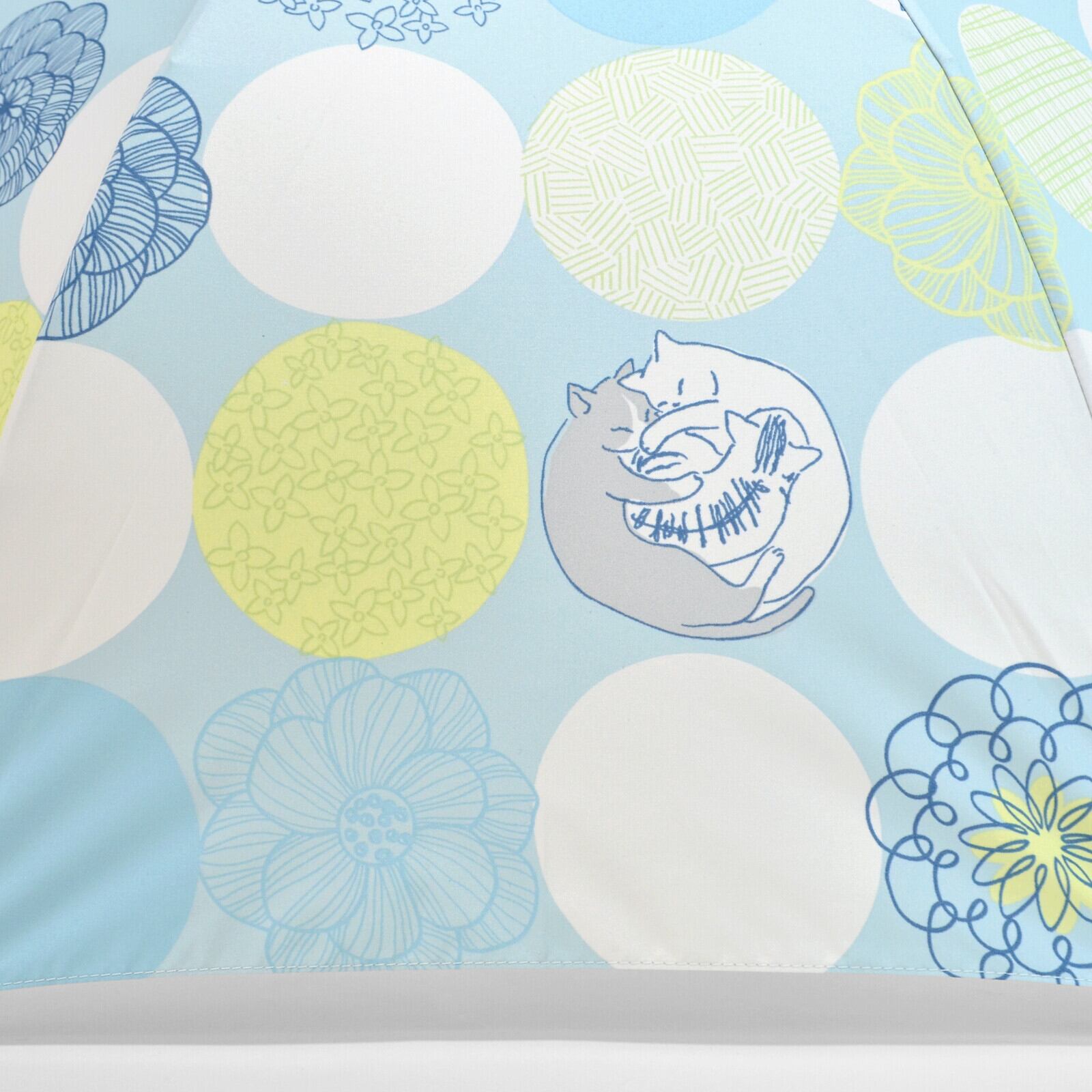 2018シーズンに雨傘で人気だったプリントが、シルバーコーティング雨晴兼用傘で復活です!!フィンランド語で、「パッロクオシ」は丸模様、「キッサ」は猫を意味します。その名の通り『丸』をモチーフにして、ころころと並ぶ丸模様の中に、3匹くっついて丸まった猫ちゃん達がそっと隠れていて、北欧風のお花モチーフを組み合わせたデザインの雨晴兼用傘です。傘を留めるネームバンドには、猫のあしあとホックボタン付きで、猫好きさん心をくすぐります。